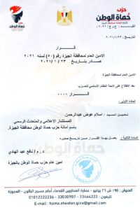 أصدر الدكتور نافع عبدالهادي أمين عام حزب حماة الوطن بمحافظة الجيزة القرار رقم ( ٥٠ ) لسنة ٢٠٢١ بتاريخ اليوم ٢٣ / ١ /٢٠٢١ بتعين الكاتب والمحلل السياسي إسلام عوض المستشار الإعلامي والمتحدث الرسمي باسم أمانة حزب حماة الوطن محافظة الجيزة .