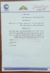 وقال عبدالنبي ، في طلب الاحاطة الذي قدمه للمستشار حنفي جبالي ، رئيس مجلس النواب ، لاحالته لوزير الاوقاف ، انه عملت بحكم المادة 134 من الدستور والمادة 212 من اللائحة ، انه تقدم بعدد من الطلبات لوزارة الاوقاف للحصول علي فرش للمساجد بدائرته الانتخابية ولم يتم تلبية أي طلب منها .