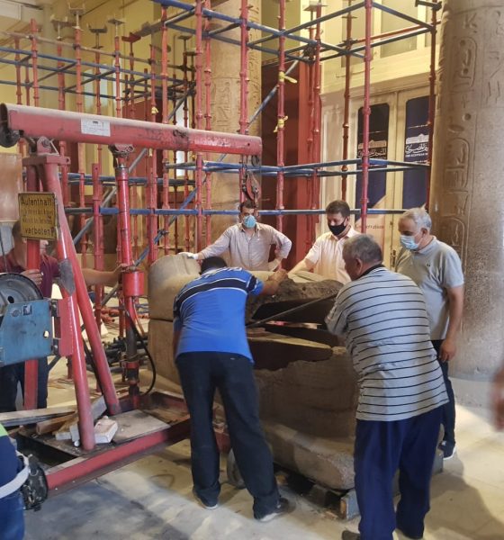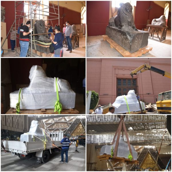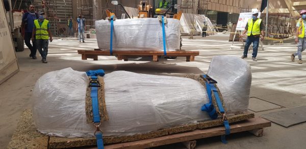 7 قطع أثرية ضخمة تصل المتحف الكبير لعرضها علي الدرج العظيم..صور