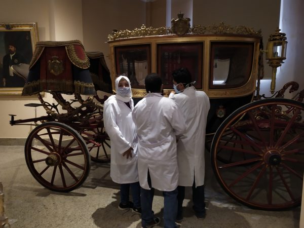 وكي نعرف قيمة العمل الذي قام به المرممون،نذكر بعضا من مقتنيات المتحف التي رصدناها أثناء جولتنا هناك،ومنها أكبر مجموعة نادرة من العربات الملكية واللوحات والصور النادرة للملك فاروق،ومجموعة صور نادرة للخيول ولوحات زيتية من عصر الأسرة العلوية.