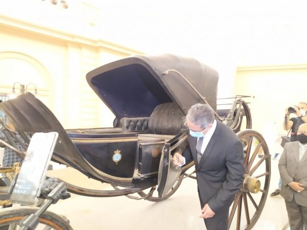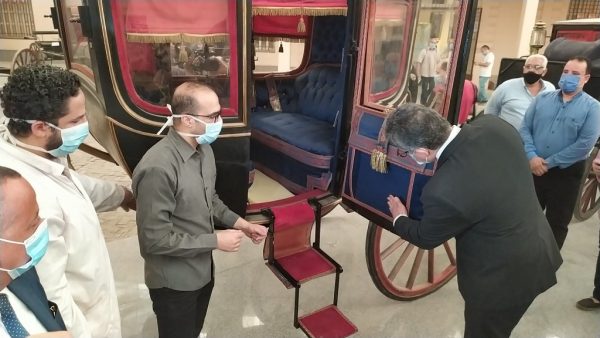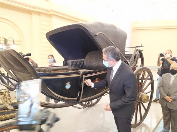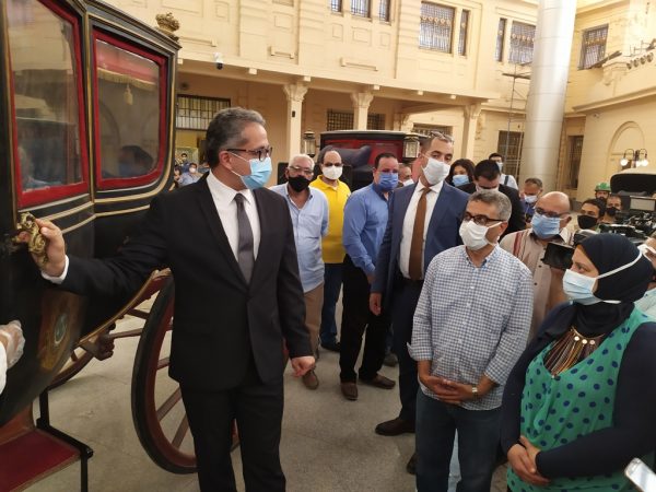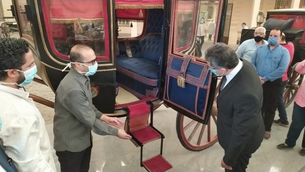 حرص الدكتور خالد العناني وزير السياحة والآثار أثناء جولته في متحف المركبات الملكية علي فحص بعض العربات المعروضة والتي انتهي مرممو الآثار في المتحف من ترميمها .