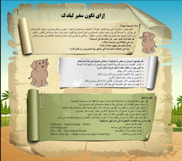» تم تخصيص جزء من الكتيب لتعليم الطفل أساسيات التعامل مع السائح وحثه على أن يكون سفيرا لبلده.