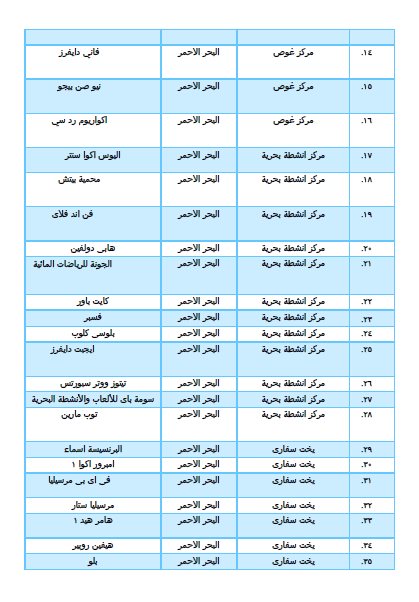 هذا بالإضافة إلى خمسة مراكز للغوص بالبحر الأحمر هم؛ باركودا و بلو وتر و فاني دايفرز و نيوصن بيجو و اكواريوم رد سي ، وثلاثة يخوت سفاري هم، هيرو و أمل حياتى و فويجر، ومركز توب مارين للأنشطة البحرية.